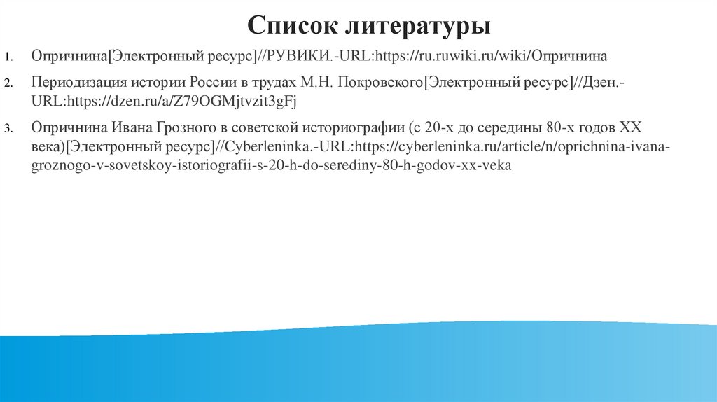 века)[Электронный ресурс]//Cyberleninka.-URL:https://cyberleninka.ru/article/n/oprichnina-ivanagroznogo-v-sovetskoy-istoriografii-s-20-h-do-serediny-80-h-godov-xx-veka