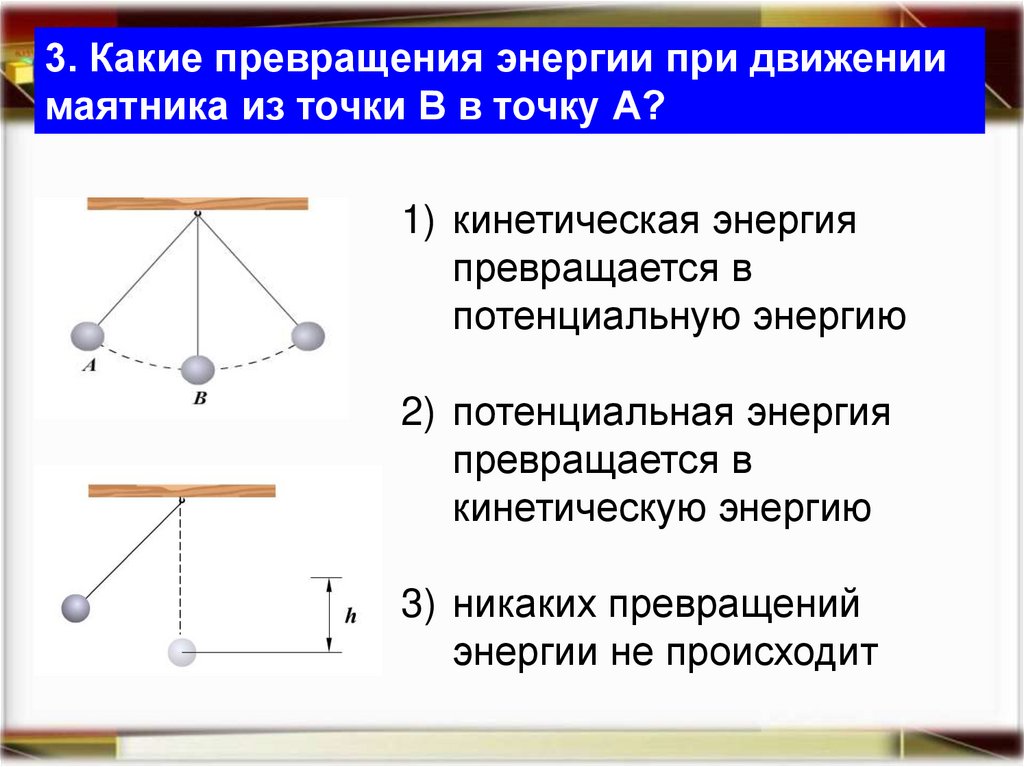 3. Какие превращения энергии при движениимаятника из точки В в точку А?