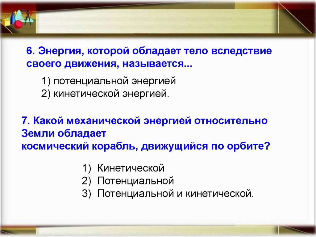 6. Энергия, которой обладает тело вследствиесвоего движения, называется...