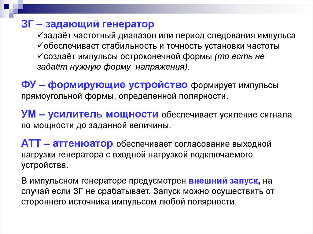 ЗГ – задающий генераторзадаёт частотный диапазон или период следования импульса