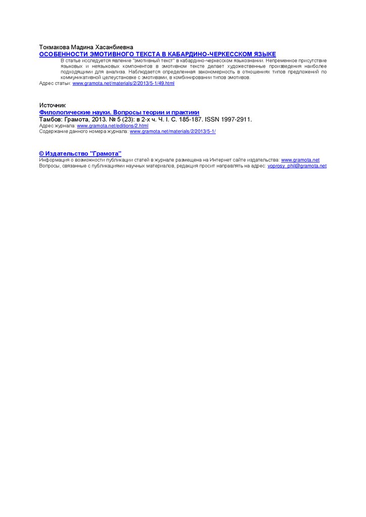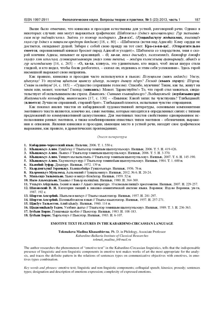Токмакова Мадина ХасанбиевнаОСОБЕННОСТИ ЭМОТИВНОГО ТЕКСТА В КАБАРДИНО-ЧЕРКЕССКОМ ЯЗЫКЕ