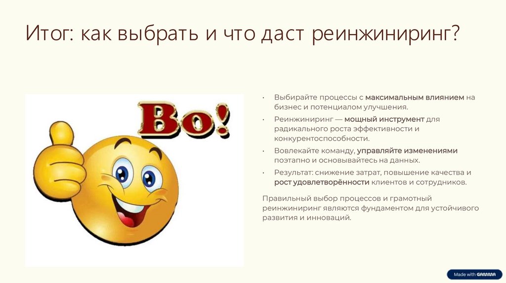 Итог: как выбрать и что даст реинжиниринг?Выбирайте процессы с максимальным влиянием на