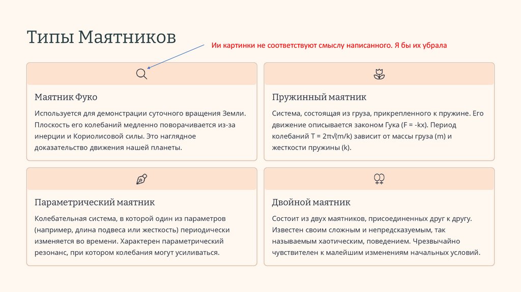 Типы МаятниковИи картинки не соответствуют смыслу написанного. Я бы их убрала
