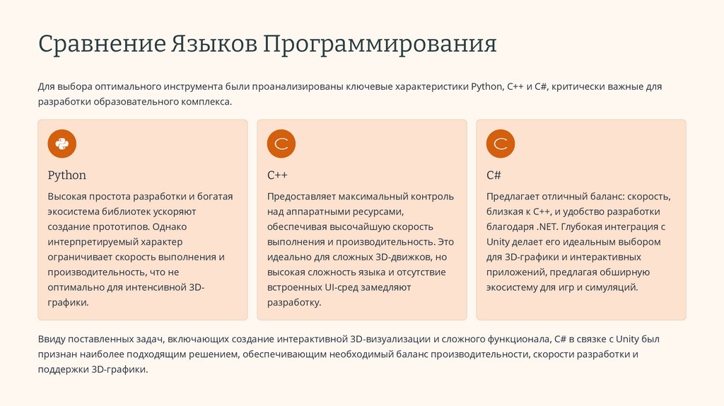 Сравнение Языков ПрограммированияДля выбора оптимального инструмента были проанализированы ключевые характеристики Python, C++ и C#, критически важные для