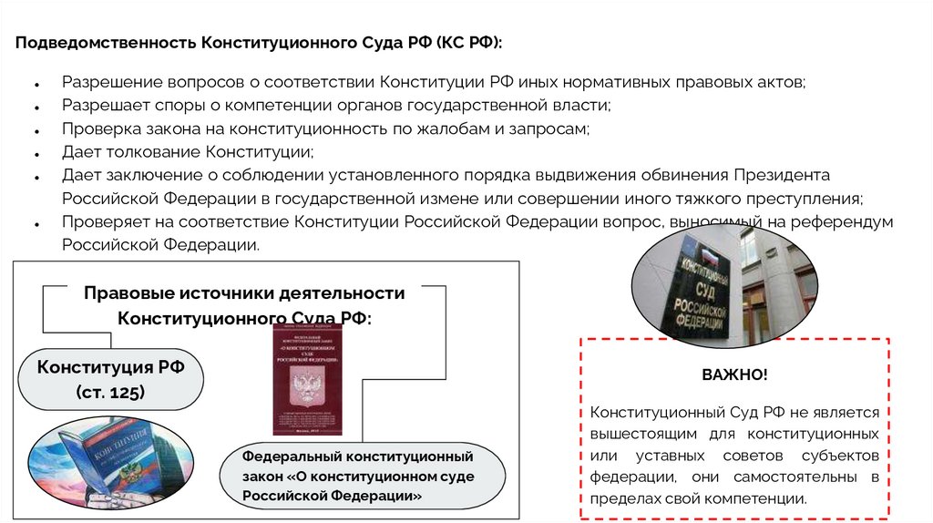 Подведомственность Конституционного Суда РФ (КС РФ):Разрешение вопросов о соответствии Конституции РФ иных нормативных правовых актов;
