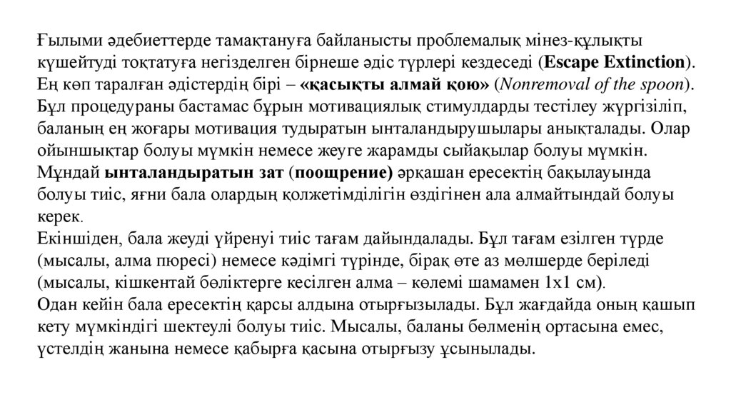 Ғылыми әдебиеттерде тамақтануға байланысты проблемалық мінез-құлықтыкүшейтуді тоқтатуға негізделген бірнеше әдіс түрлері кездеседі (Escape Extinction).