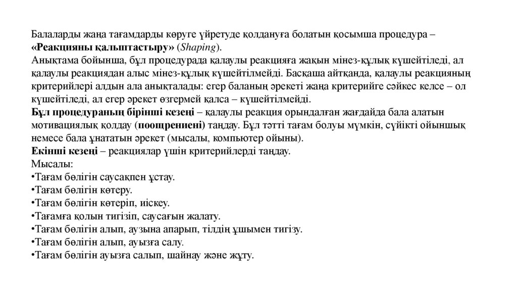 Балаларды жаңа тағамдарды көруге үйретуде қолдануға болатын қосымша процедура –«Реакцияны қалыптастыру» (Shaping).