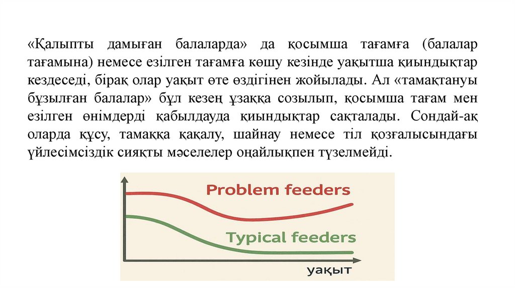 «Қалыпты дамыған балаларда» да қосымша тағамға (балалартағамына) немесе езілген тағамға көшу кезінде уақытша қиындықтар
