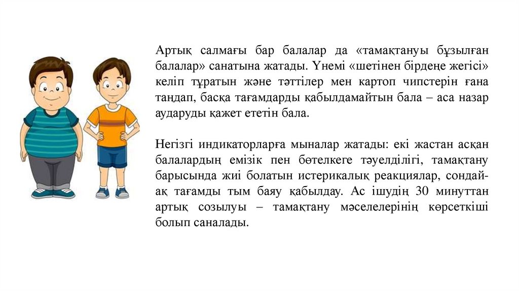 Артық салмағы бар балалар да «тамақтануы бұзылғанбалалар» санатына жатады. Үнемі «шетінен бірдеңе жегісі»