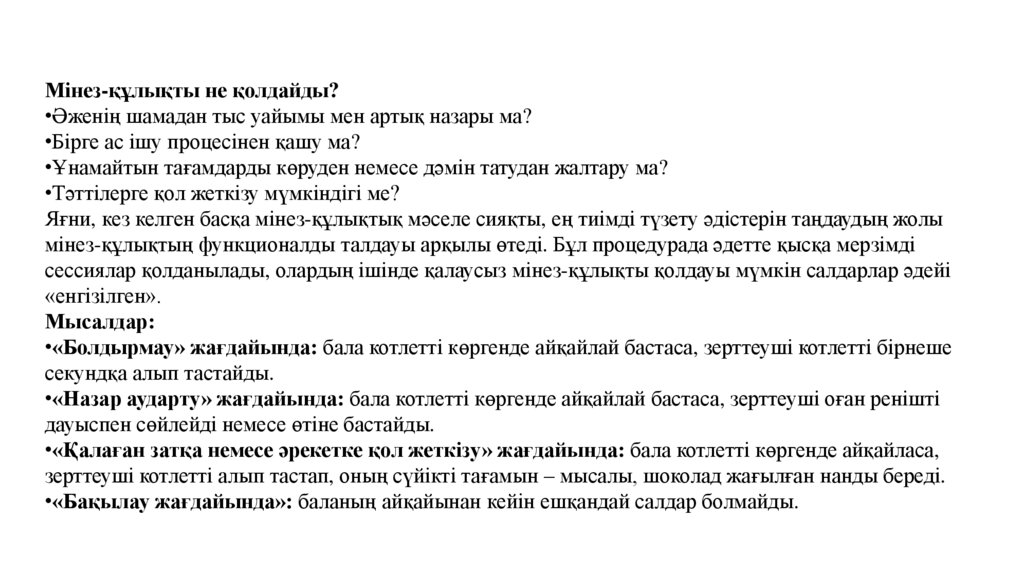 Сондай-ақ, бағалау және деректерді тіркеу кезінде өтпелі сәттерде туындайтын проблемалық мінезқұлыққа назар аудару қажет (мысалы, бала әр жолы ас ішер алдында теледидар көреді, ал оны асханаға