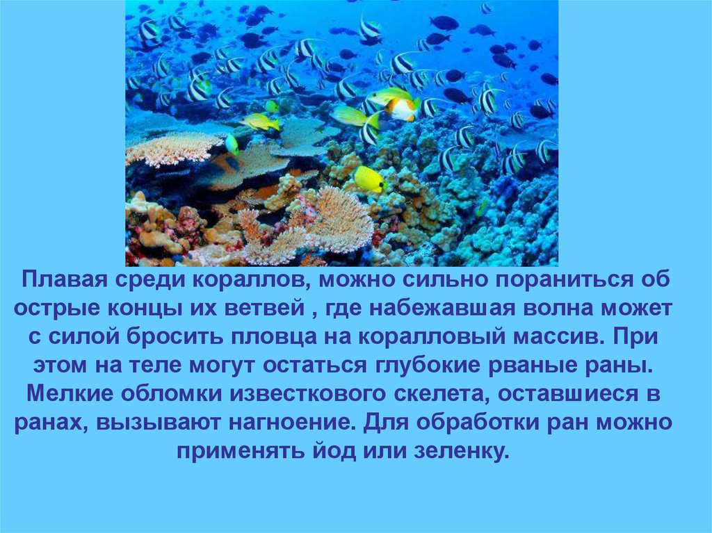 Плавая среди кораллов, можно сильно пораниться обострые концы их ветвей , где набежавшая волна может