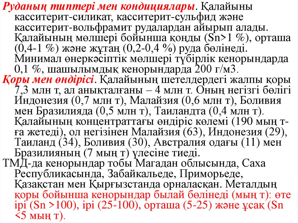 Қалайының концентраттағы өндiрiс көлемi (190 мың тға жетедi), ол негiзiнен Малайзия (63), Индонезия (29),