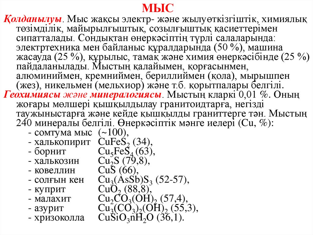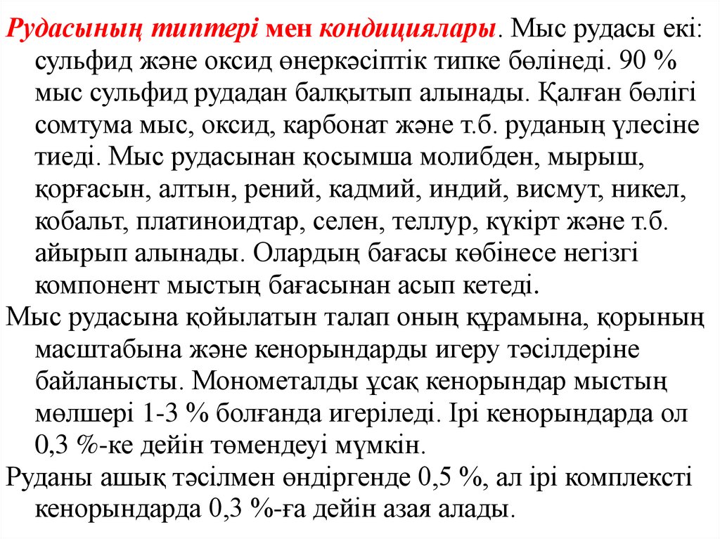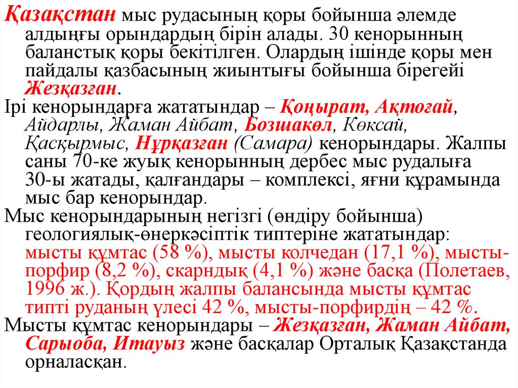 Қазақстан мыс рудасының қоры бойынша әлемдеалдыңғы орындардың бiрiн алады. 30 кенорынның