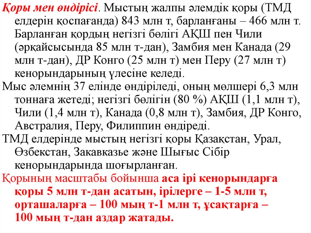 Қоры мен өндiрiсi. Мыстың жалпы әлемдiк қоры (ТМДелдерiн қоспағанда) 843 млн т, барланғаны – 466 млн т.