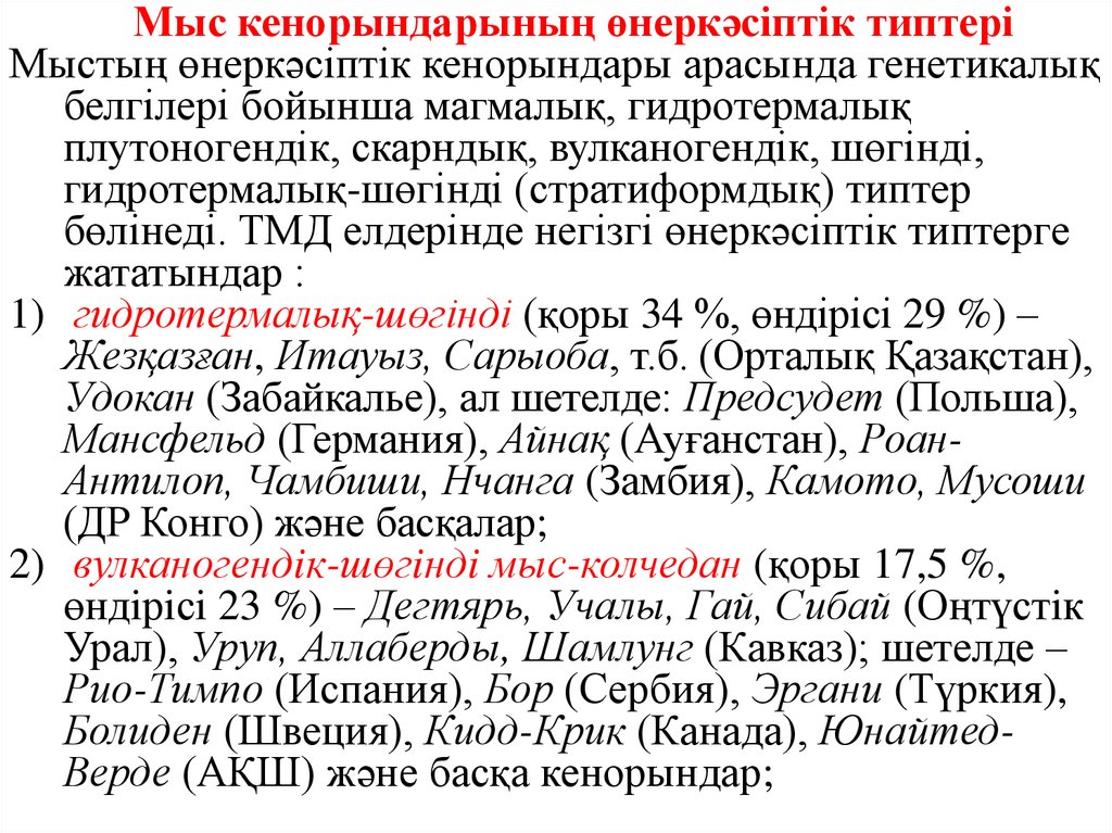 Мыс кенорындарының өнеркәсiптiк типтерiМыстың өнеркәсiптiк кенорындары арасында генетикалық
