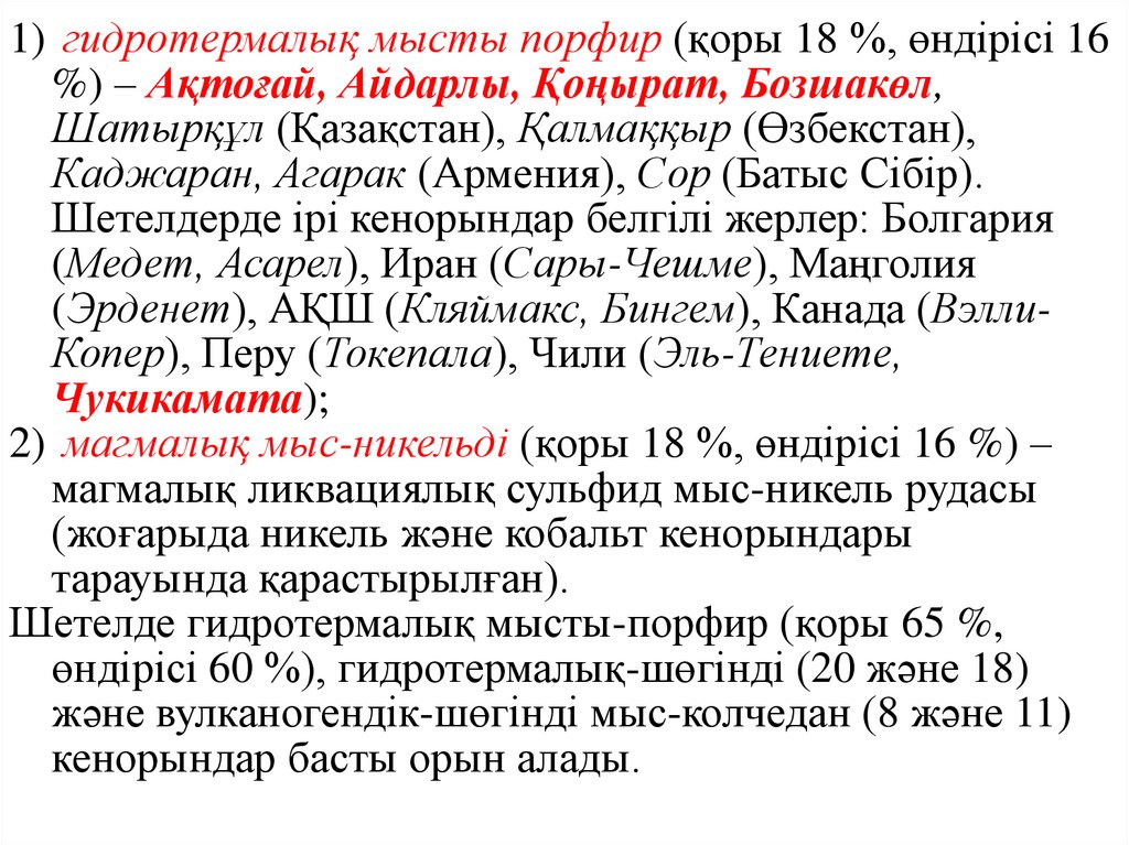 1) гидротермалық мысты порфир (қоры 18 %, өндiрiсi 16%) – Ақтоғай, Айдарлы, Қоңырат, Бозшакөл,