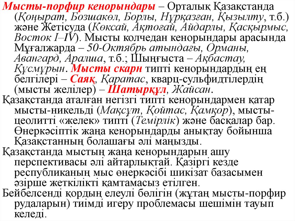 Мысты-порфир кенорындары – Орталық Қазақстанда(Қоңырат, Бозшакөл, Борлы, Нұрқазған, Қызылту, т.б.)