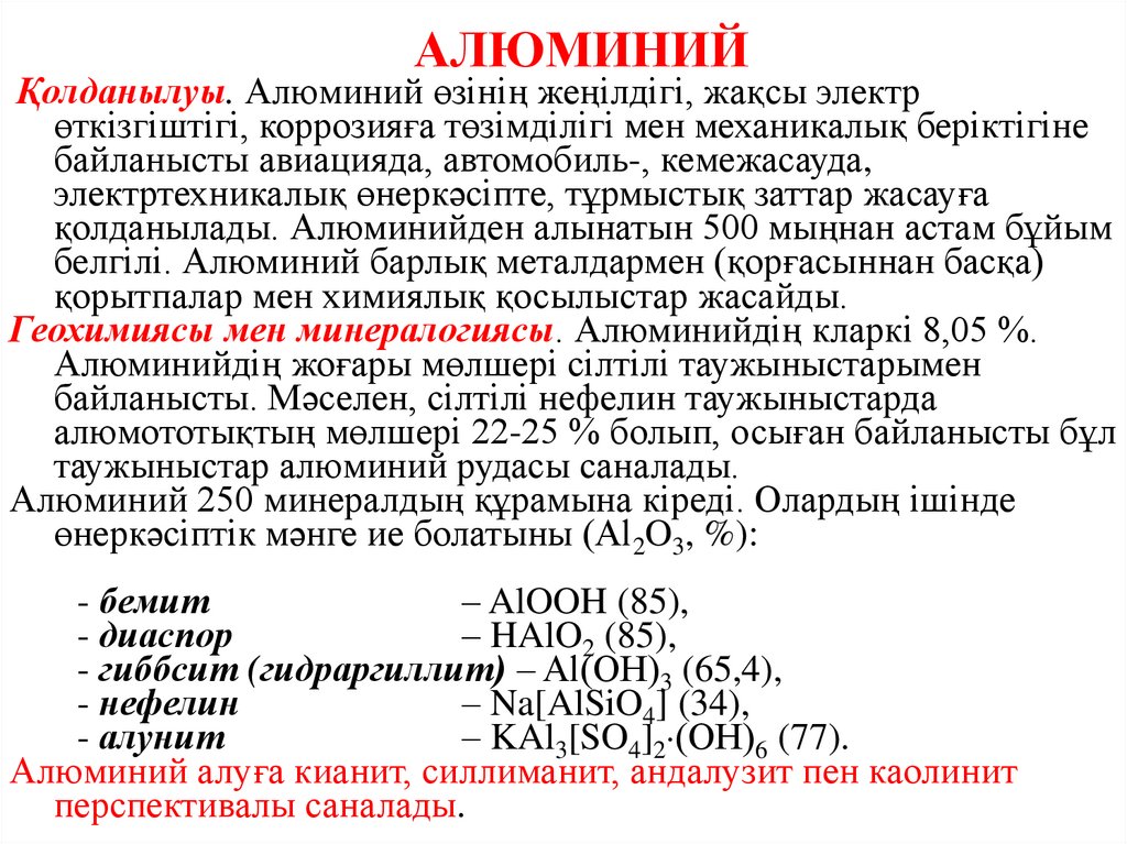 Геохимиясы мен минералогиясы. Алюминийдiң кларкi 8,05 %.