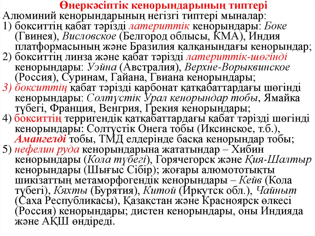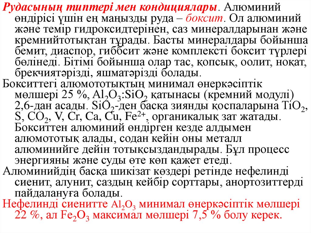 Рудасының типтерi мен кондициялары. Алюминийөндiрiсi үшiн ең маңызды руда – боксит. Ол алюминий
