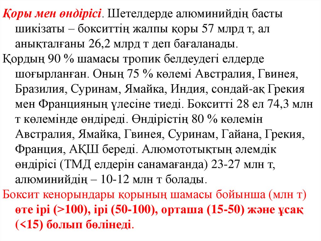 Қоры мен өндiрiсi. Шетелдерде алюминийдiң бастышикiзаты – бокситтiң жалпы қоры 57 млрд т, ал