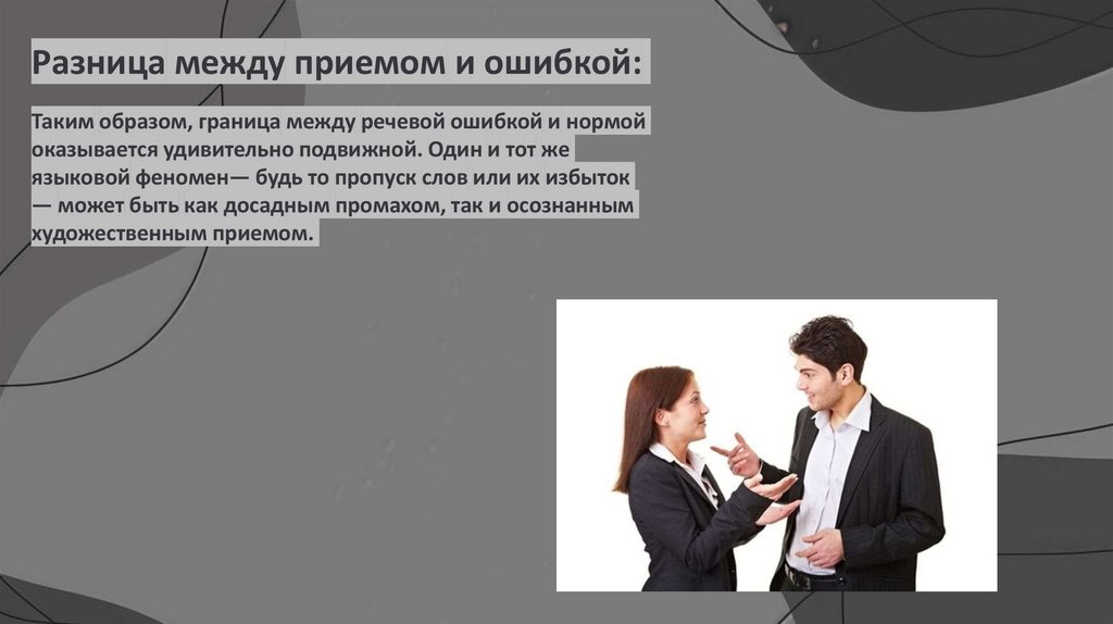 Разница между приемом и ошибкой:Таким образом, граница между речевой ошибкой и нормой