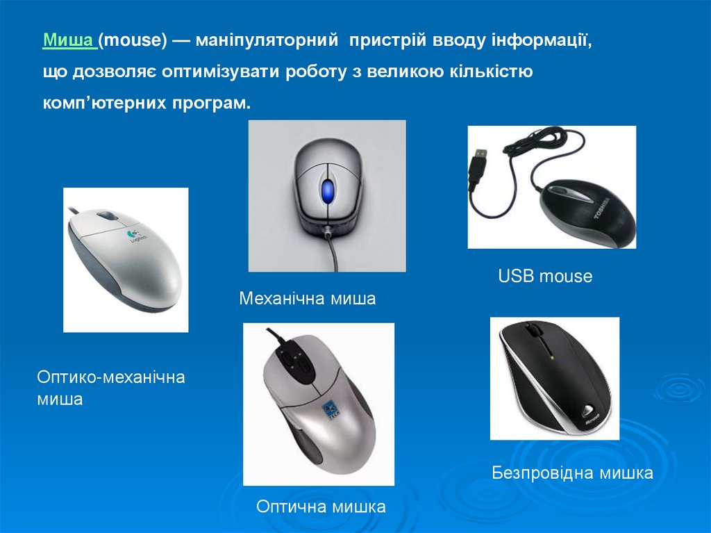 Миша (mouse) — маніпуляторний пристрій вводу інформації,що дозволяє оптимізувати роботу з великою кількістю