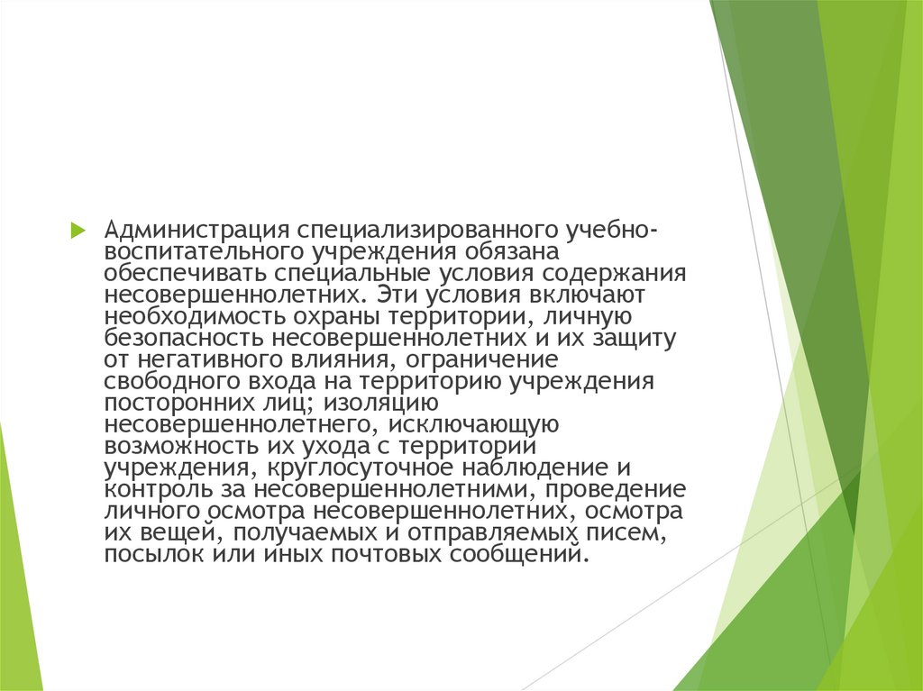 Администрация специализированного учебновоспитательного учреждения обязанаобеспечивать специальные условия содержания