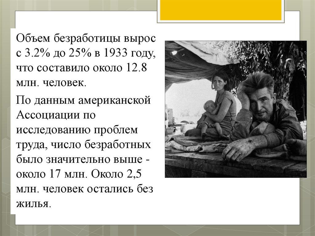 Объем безработицы выросс 3.2% до 25% в 1933 году,