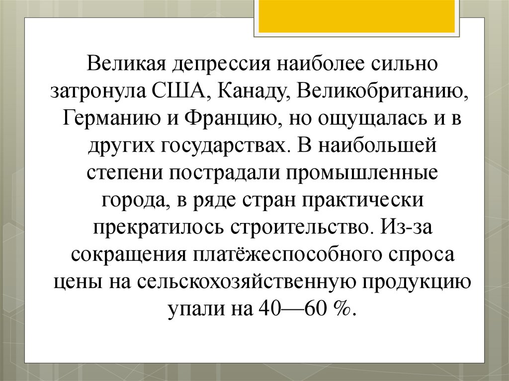 Великая депрессия наиболее сильнозатронула США, Канаду, Великобританию,