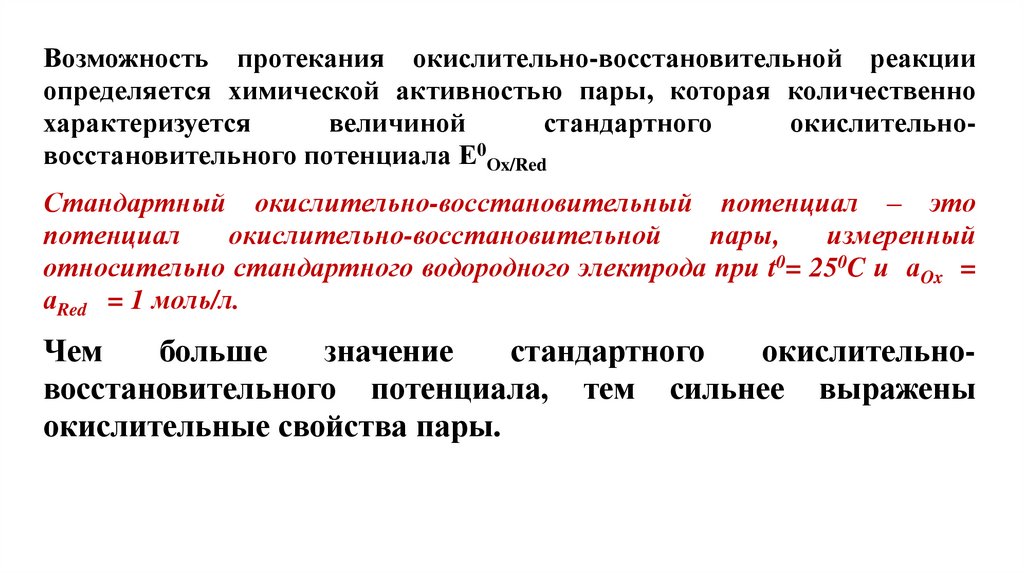 Возможность протекания окислительно-восстановительной реакцииопределяется химической активностью пары, которая количественно