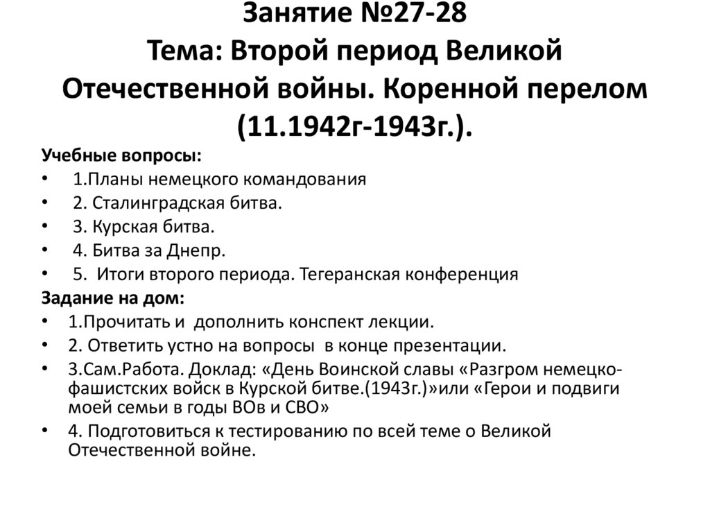 1. Занятие №27-28 Тема: Второй период Великой Отечественной войны. Коренной перелом (11.1942г-1943г.).