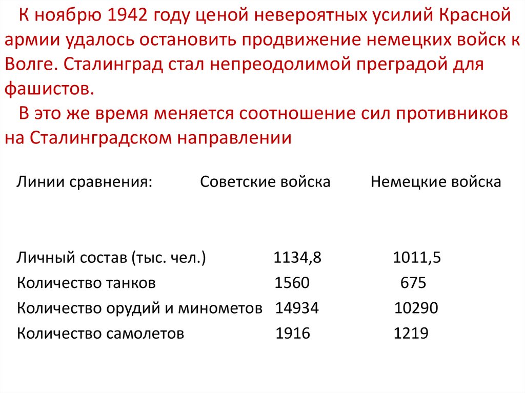 К ноябрю 1942 году ценой невероятных усилий Краснойармии удалось остановить продвижение немецких войск к
