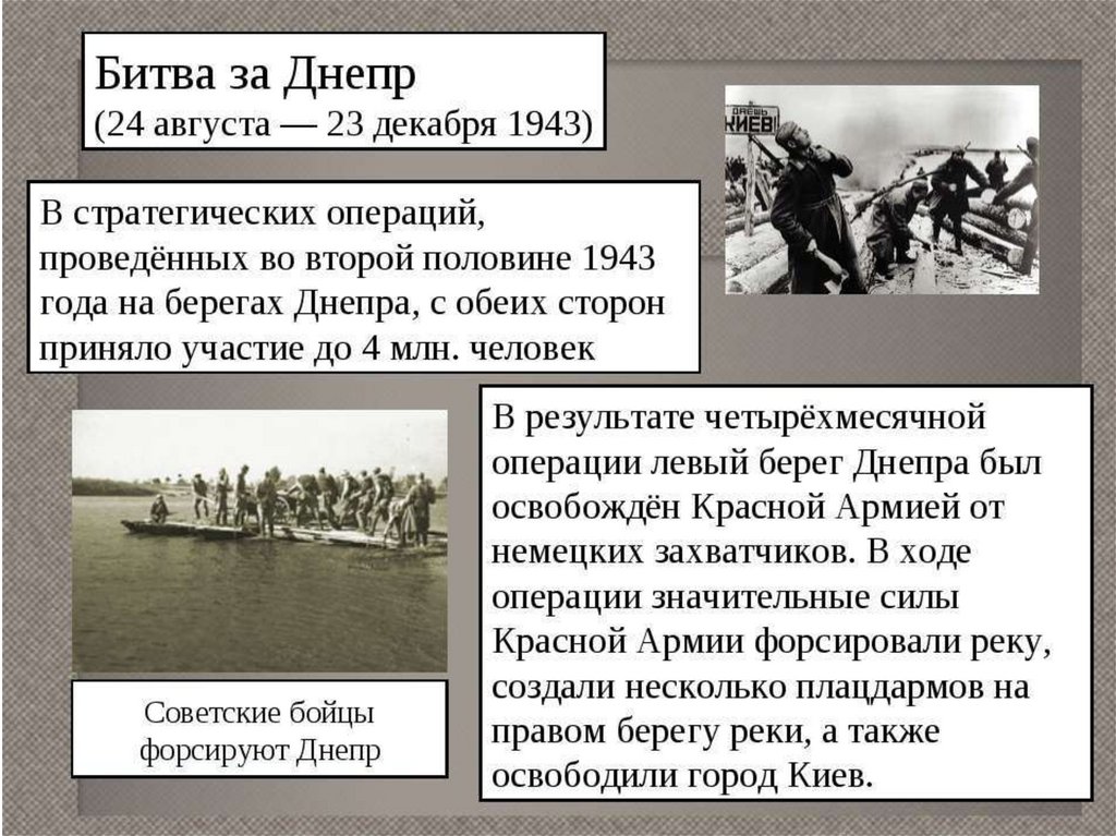 30. 4-й вопрос: Битва за Днепр Закрепление коренного перелома произошло в сентябре 1943 года в битве за Днепр. Советские войска
