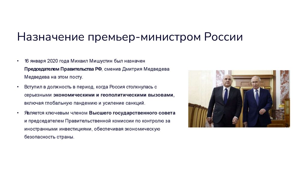 Назначение премьер-министром России16 января 2020 года Михаил Мишустин был назначен