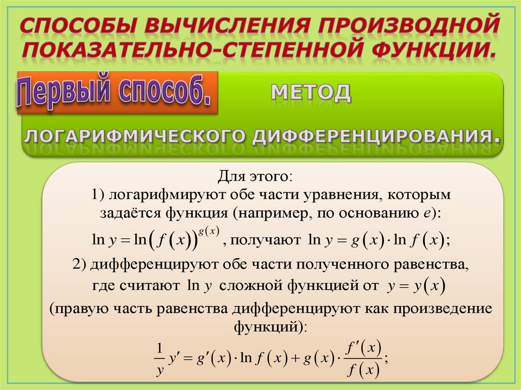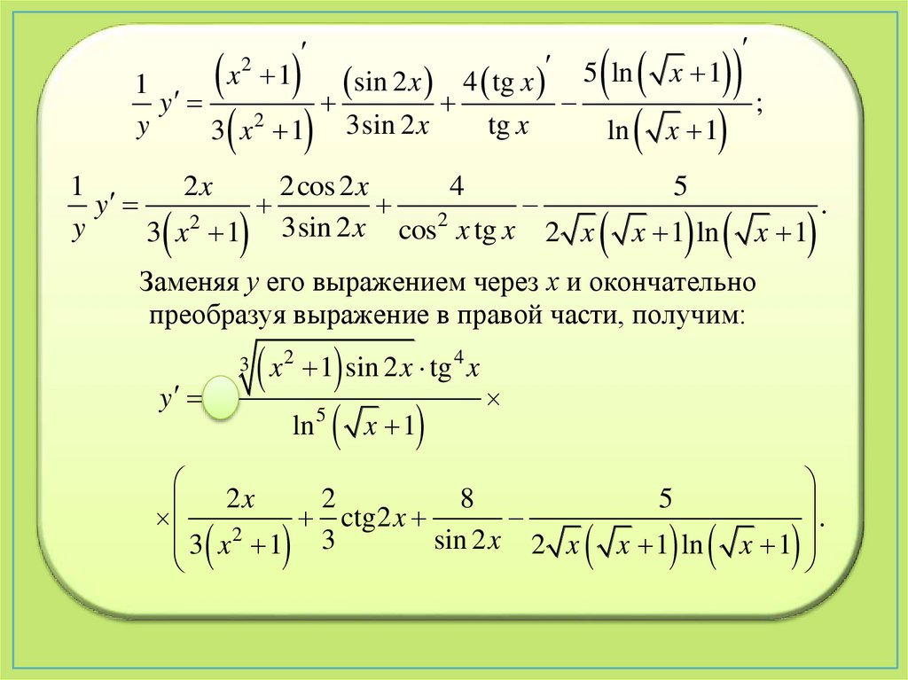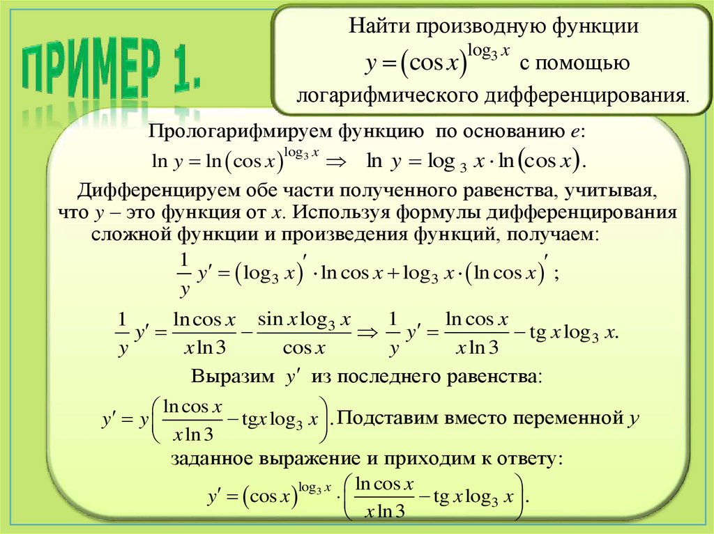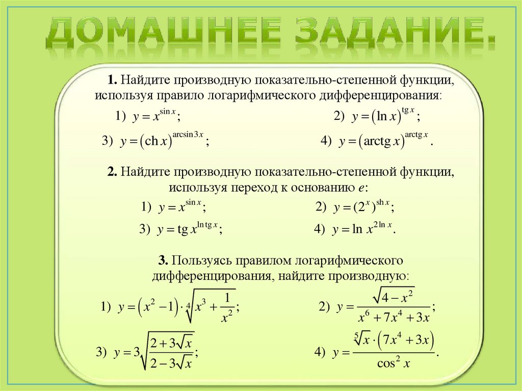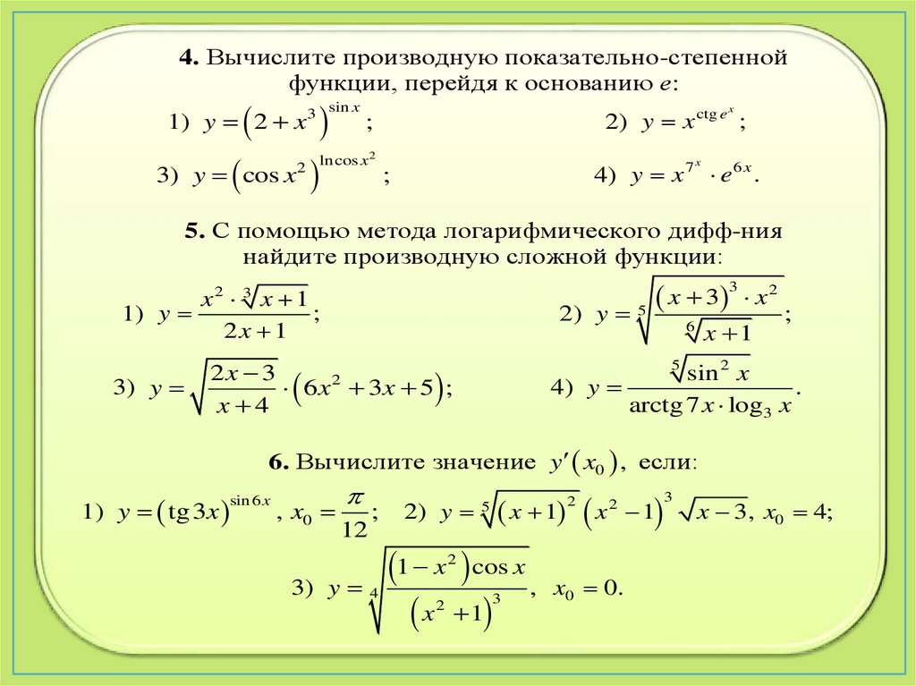 1. Найдите производную показательно-степенной функции,используя правило логарифмического дифференцирования: