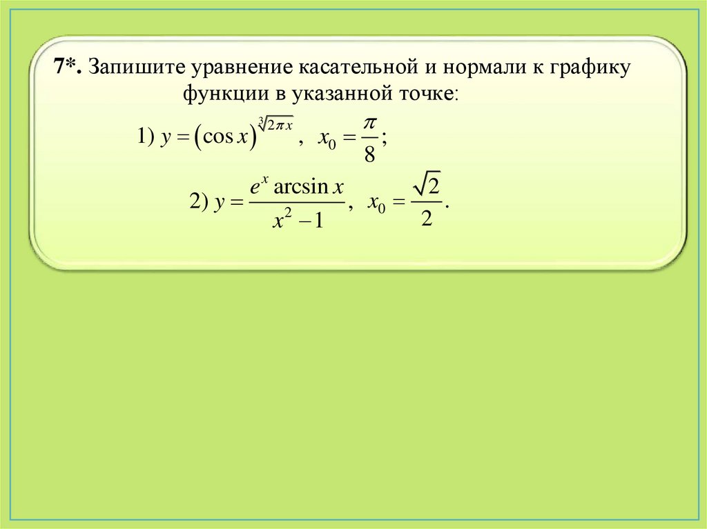 7*. Запишите уравнение касательной и нормали к графикуфункции в указанной точке: