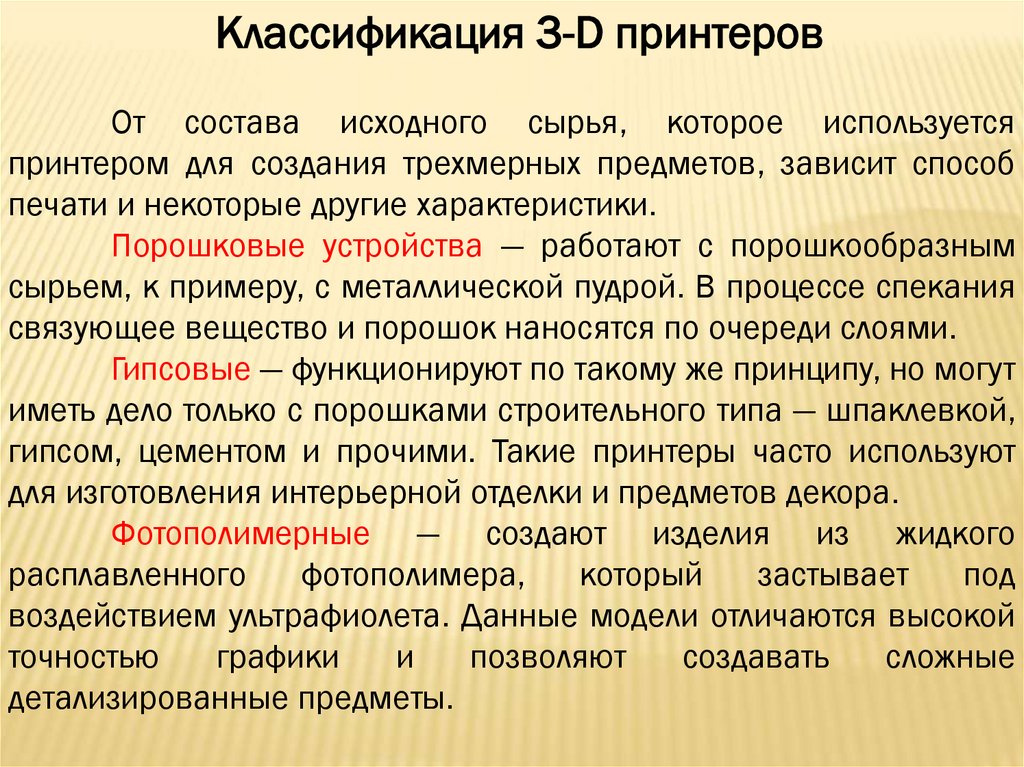 Принципиальные различия между моделями настольковелики, что классифицировать 3D-принтеры можно как