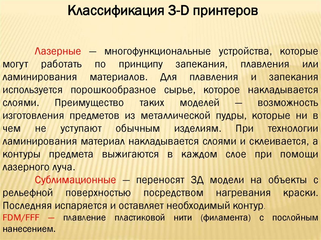 Классификация 3-D принтеровЛазерные — многофункциональные устройства, которые