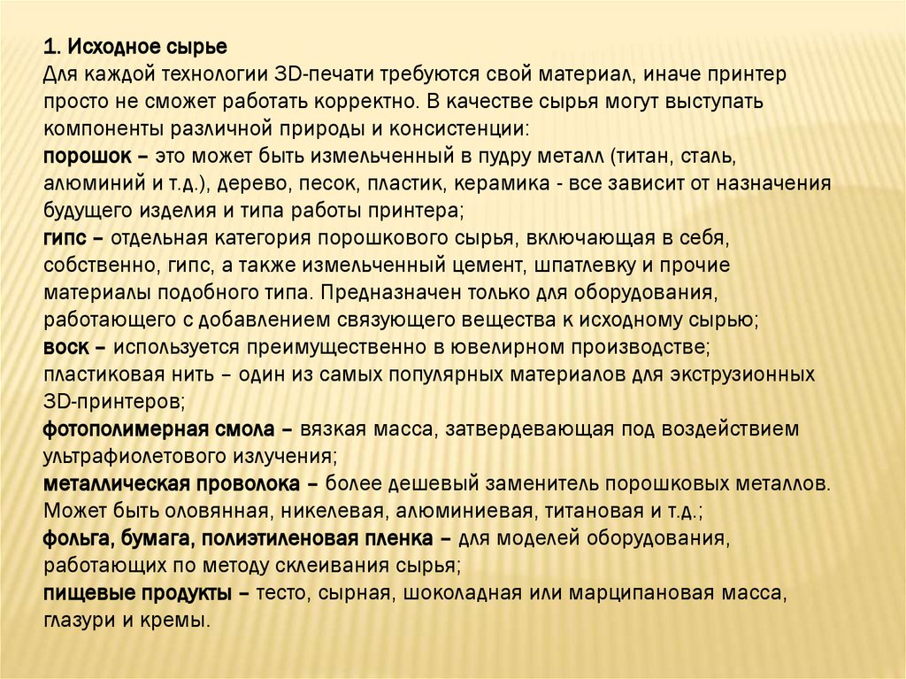 1. Исходное сырьеДля каждой технологии 3D-печати требуются свой материал, иначе принтер