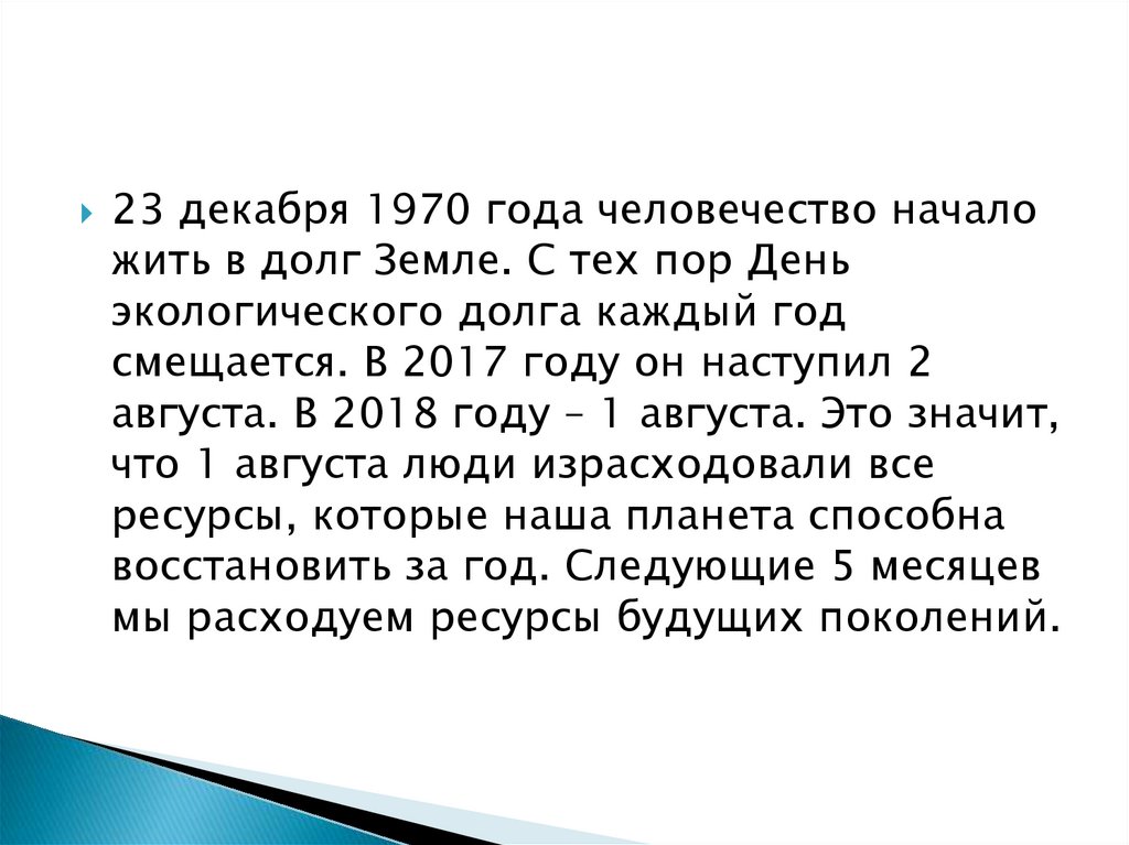 23 декабря 1970 года человечество началожить в долг Земле. С тех пор День