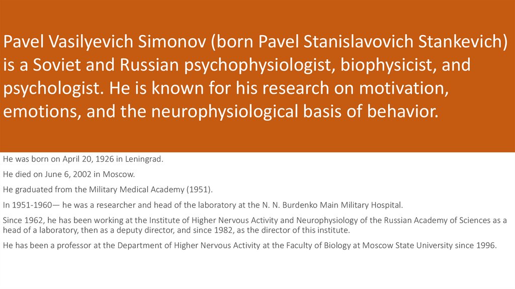 Pavel Vasilyevich Simonov (born Pavel Stanislavovich Stankevich)is a Soviet and Russian psychophysiologist, biophysicist, and