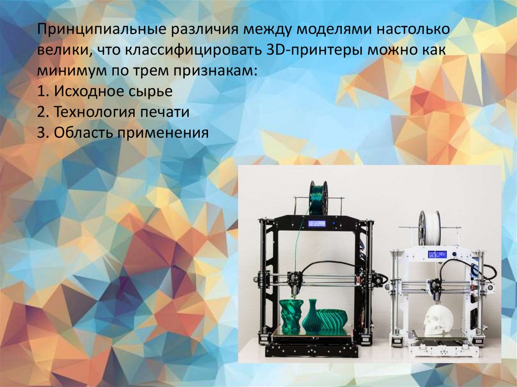 Принципиальные различия между моделями настольковелики, что классифицировать 3D-принтеры можно как
