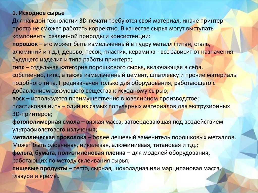 1. Исходное сырьеДля каждой технологии 3D-печати требуются свой материал, иначе принтер