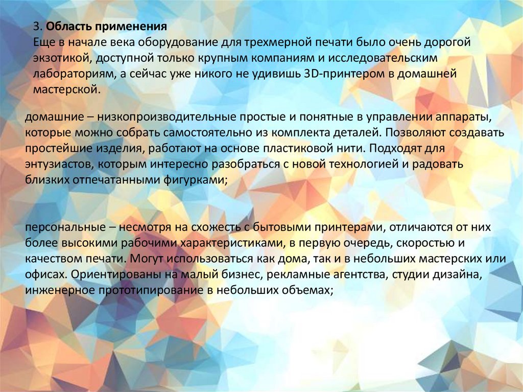 3. Область примененияЕще в начале века оборудование для трехмерной печати было очень дорогой