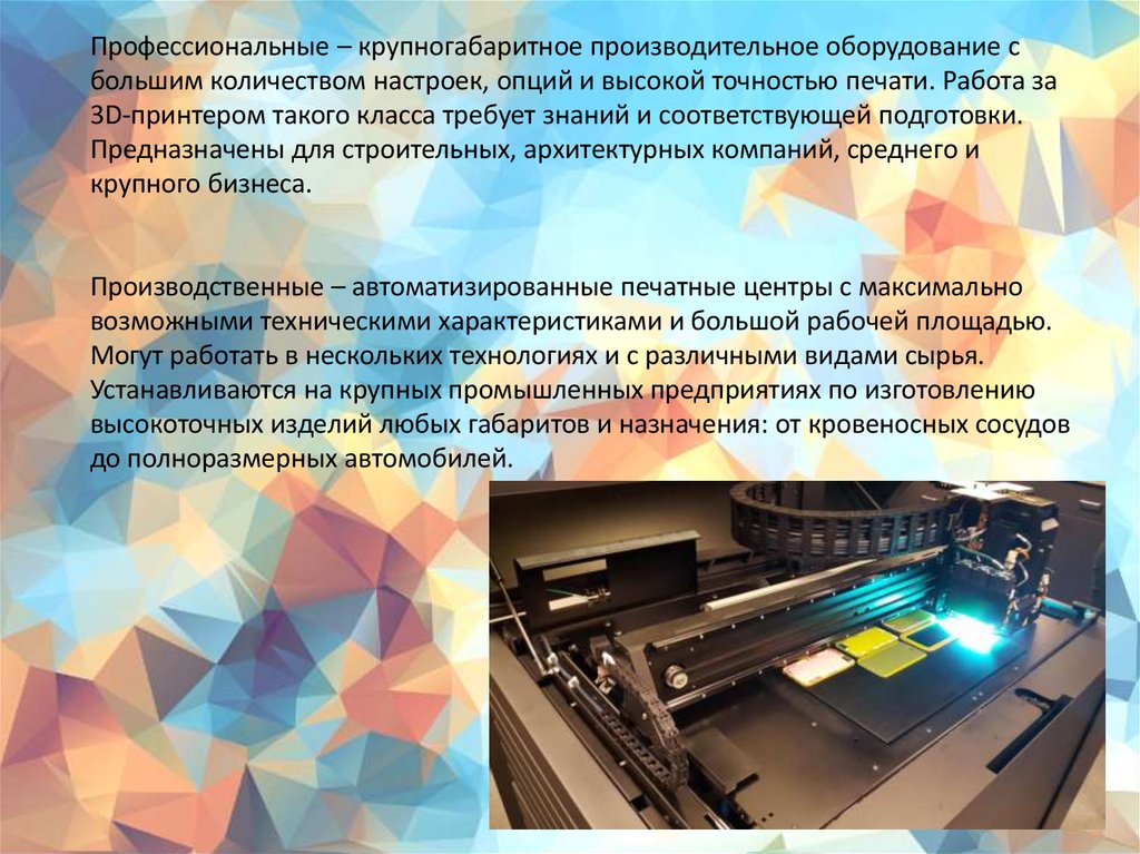Профессиональные – крупногабаритное производительное оборудование сбольшим количеством настроек, опций и высокой точностью печати. Работа за