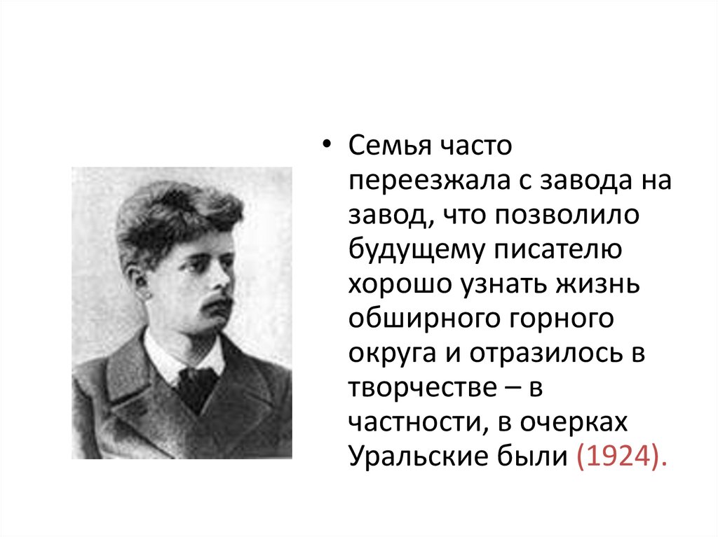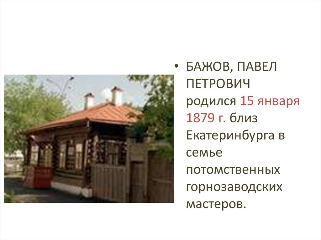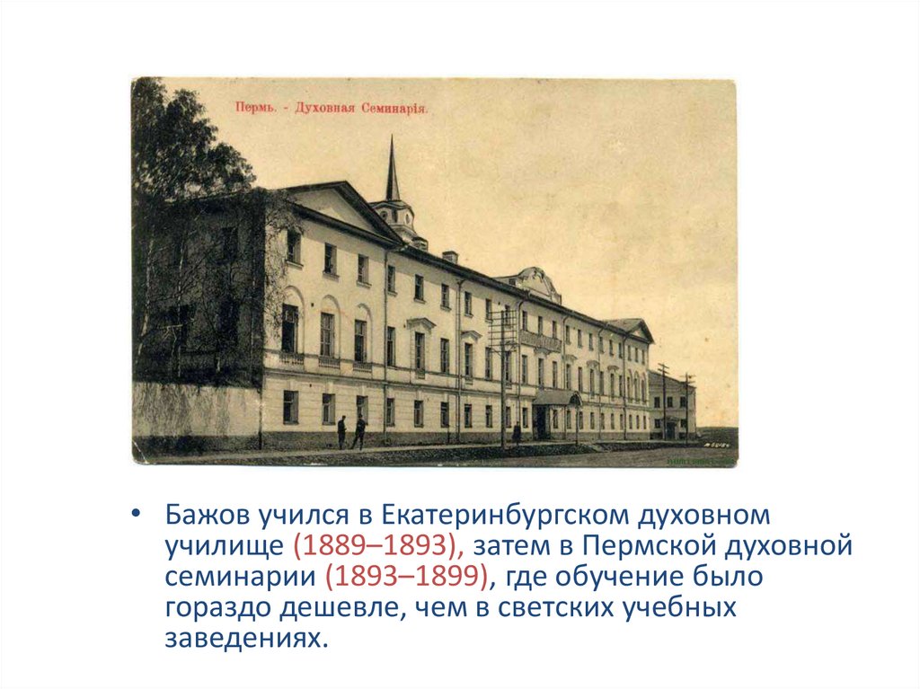 • Бажов учился в Екатеринбургском духовномучилище (1889–1893), затем в Пермской духовной