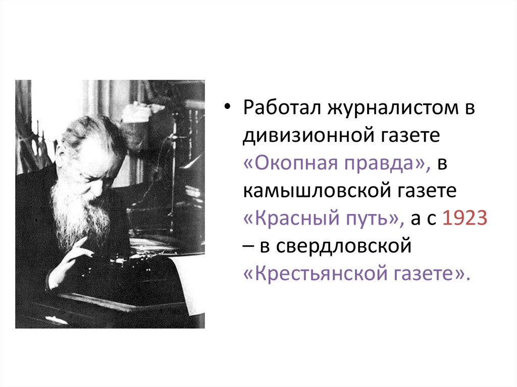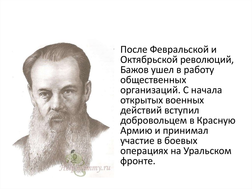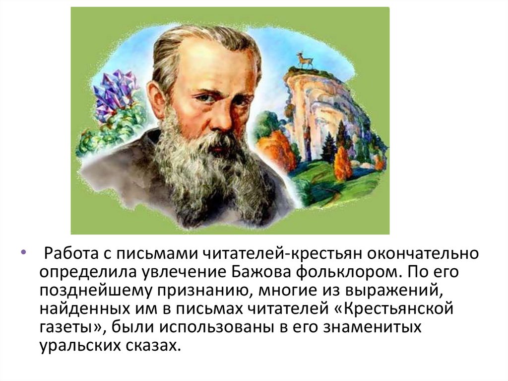• Работа с письмами читателей-крестьян окончательноопределила увлечение Бажова фольклором. По его
