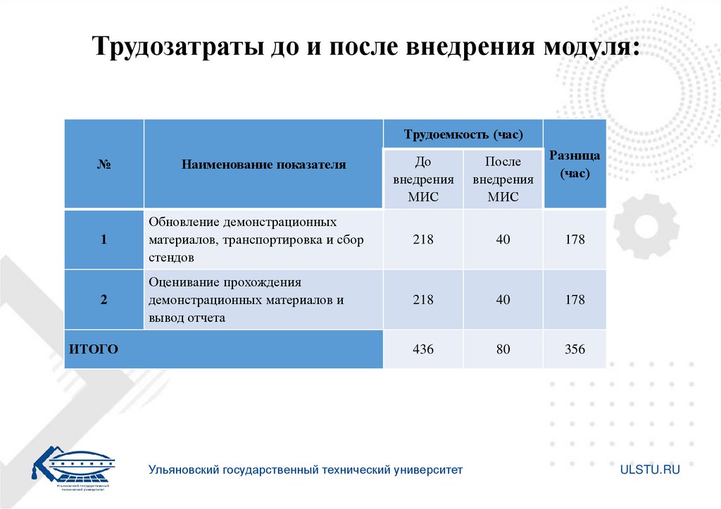 Трудозатраты до и после внедрения модуля:Трудоемкость (час)
