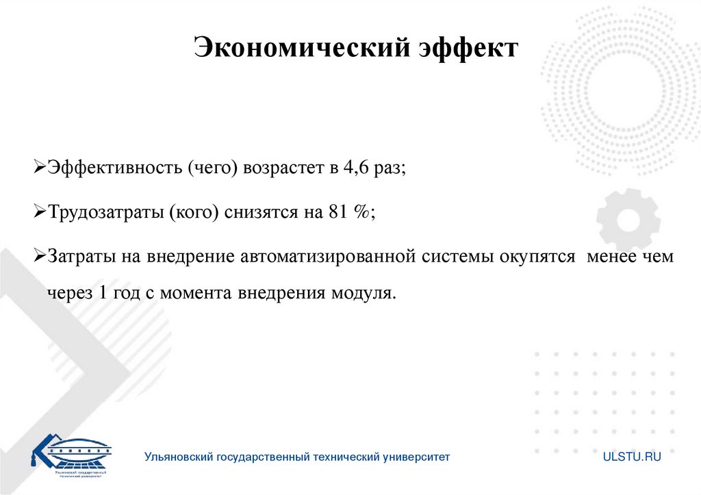 Экономический эффектЭффективность (чего) возрастет в 4,6 раз;