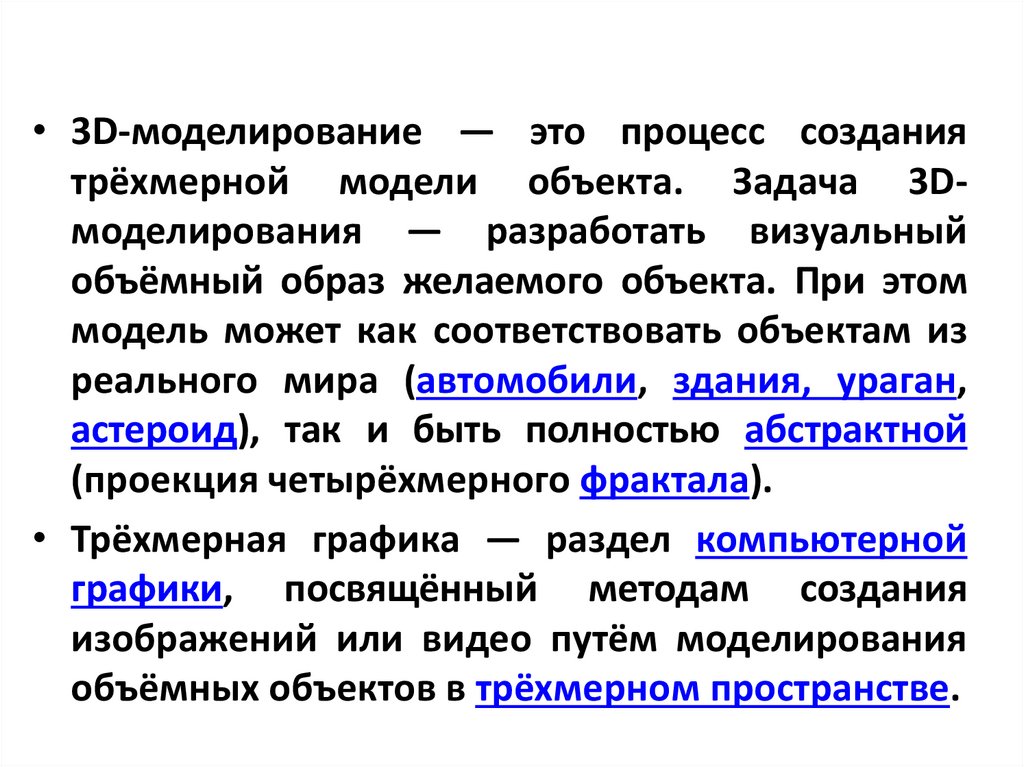 • 3D-моделирование — это процесс созданиятрёхмерной модели объекта. Задача 3Dмоделирования — разработать визуальный